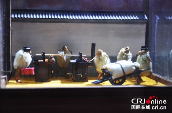 还有一些模型再现了据郭氏夫妇称现正逐渐消失的古老习俗。他们最精妙复杂的作品之一——中国传统婚礼包含了30多只“猴”,花了两个月时间才完成。轿子停在胡同里的新郎家门口,新娘正迈出轿子,新郎一家在屋外迎接。几个仆人侍立在旁,四个乐手在敲锣吹号。新娘这边的亲戚送来嫁妆。