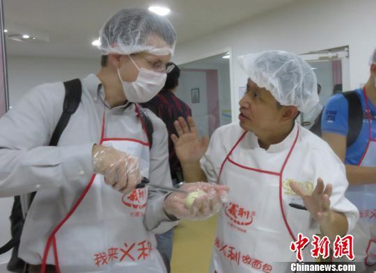 图为中国师傅为外国友人讲解面包制作流程。 曾鼐 摄