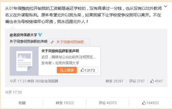 17日下午5点多,何炅再度通过微博发声,首度直面吃空饷质疑,称“从2007年调整岗位开始我的工资都是返还学校的,没有再拿过一分钱,也从没有以北外教师名义在外谋取私利。”何炅表示,“原本希望北外以我为荣,如果我留下让学校受争议我可以离开。不在编也会为母校继续尽心尽责,我永远是北外人!”