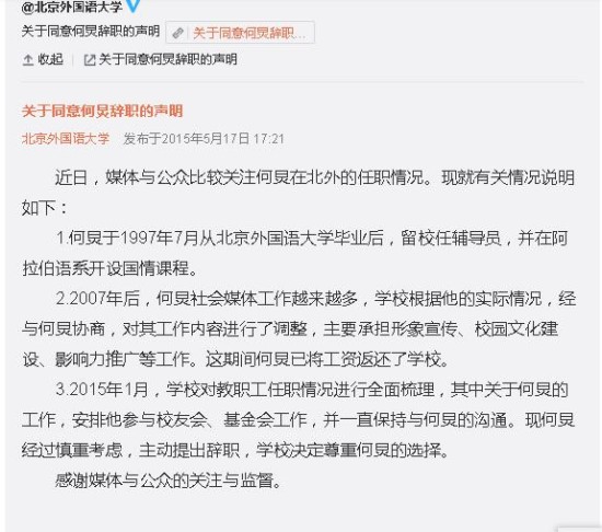 新加坡《联合早报》网站5月18日报道,北京外国语大学5月17日下午也发表声明,表示同意何炅提出的辞职。北外是何炅的母校,该声明强调,何炅于1997年7月毕业后,留校任辅导员,并在阿拉伯语系开设国情课程。