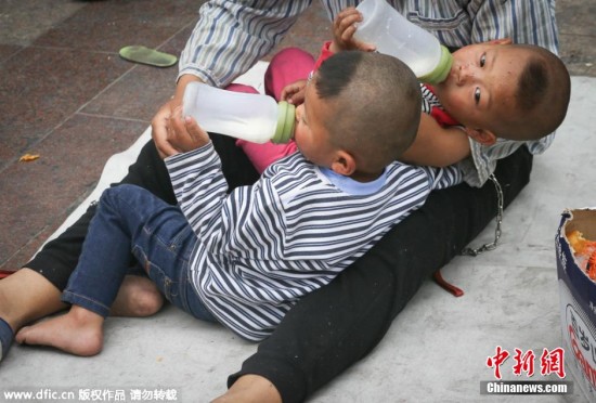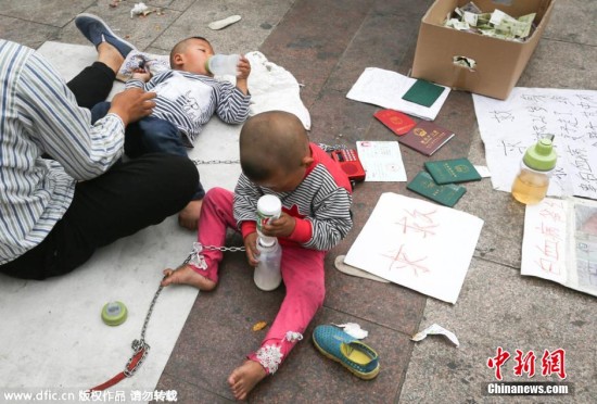 2015年5月1日,一位男子在北京站前广场地铁口将一对双胞胎用铁链拴在腰间乞讨。地上的求助信写道,该名男子得了白血病,妻子离他而去,丢下三个孩子,其中一对双胞胎。路人问他为什么将孩子拴起来,他说怕跑丢了。图片来源:东方ic 版权作品 请勿转载