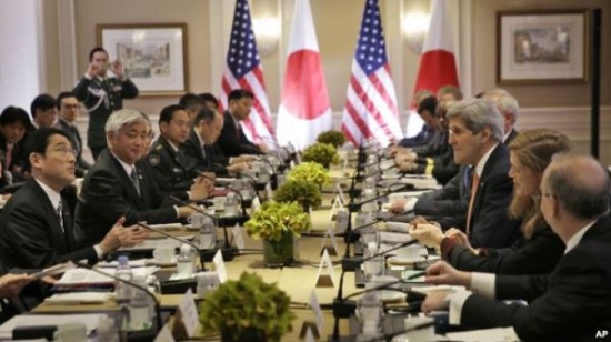 2015年4月27日,日本外相岸田文雄(左)、防卫相中谷元(左二)和美国国务卿克里(右三)、国防部长卡特(照片中见不到)等外交和防务官员在纽约会晤。(美国之音电台)