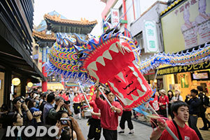 10月1日在横滨中华街上举行了庆祝中国国庆的舞龙表演。