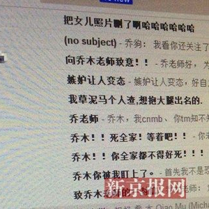 他说,还有网友晒出了其女儿的打码照片,后来几经交涉对方才将之删除,“那是我一个学生,”乔木称,这位学生还威胁将公布其女儿不打码照片。