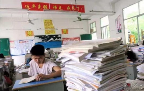 2015年5月21日,广西桂北,高三教室里高悬着一条条“励志”的高考标语,成了一道独特的风景线。“进清华,与主席总理称兄道弟;入北大,同大家巨匠论道谈经”的标语。