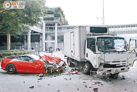 跑车失控越过对面线,一辆货车刚驶出,法拉利拦腰撞向货车右车身,法拉利车头被撞至扭曲变形犹如废铁,零件散落一地,而货车右车头灯和泵把被撞烂,右头辘被撞歪。何报称胸口痛,与货车上李姓男司机称颈及腰部痛,姓杨男跟车工人感晕眩,共三人被送往医院。