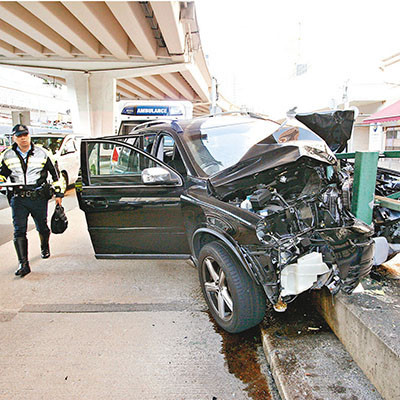 失事黑色豪华四驱车,事后搁在黄泥涌道近马场对开,通往香港仔隧道天桥支路入口范围,车头直撞防撞栏,严重损毁凹陷,除“泵把”飞脱,车头亦告折曲,前座左右两边安全气袋全部应声弹出。防撞栏陷入车头引擎室位置最少3呎,几乎直撞入车厢,惊吓场面令人心惊肉跳。