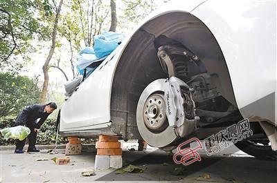 昨日,停放在重庆大学B区的一辆玛莎拉蒂豪车被架在几块砖头上,车轮不翼而飞。 重庆晨报记者 胡杰 摄