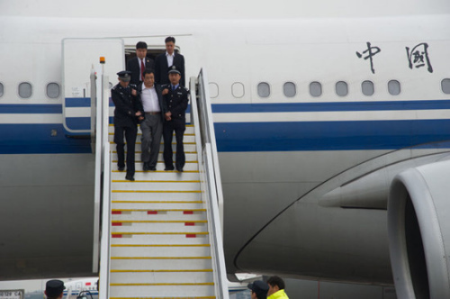 5月9日,在北京首都国际机场,李华波(中)被押解下飞机。 新华社记者 陈晔华 摄