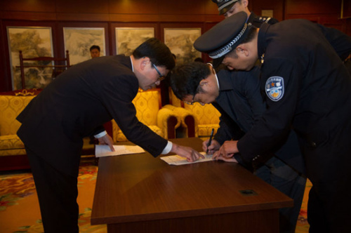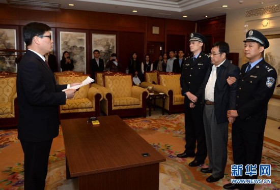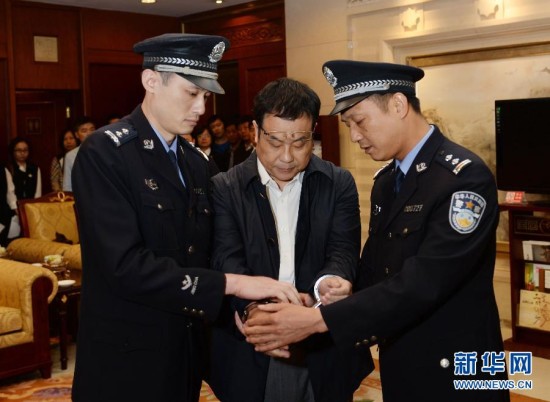 5月9日,在北京首都国际机场,江西省上饶市检察院工作人员向李华波(右二)宣布逮捕。当日,在中央反腐败协调小组的统一部署下,潜逃新加坡4年之久的江西省鄱阳县财政局经济建设股原股长李华波被遣返回国。这是“天网”行动开展以来职务犯罪国际追逃追赃专项行动取得的重要战果,也是公开曝光百名外逃人员后遣返的重要案犯。李华波,国际刑警组织红色通缉令号码A-1256/2-2011。新华社记者 陈晔华 摄