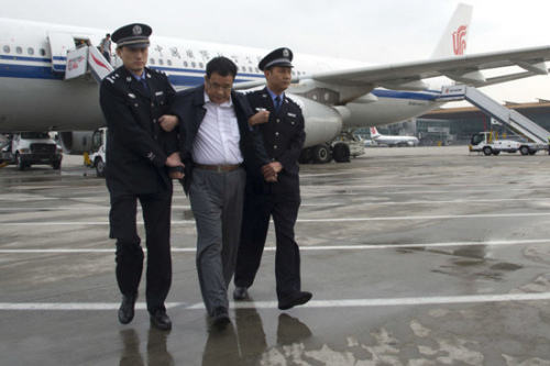 5月9日,在北京首都国际机场,李华波(中)被押解下飞机。当日,在中央反腐败协调小组的统一部署下,潜逃新加坡4年之久的江西省鄱阳县财政局经济建设股原股长李华波被遣返回国。这是“天网”行动开展以来职务犯罪国际追逃追赃专项行动取得的重要战果,也是公开曝光百名外逃人员后遣返的重要案犯。李华波,国际刑警组织红色通缉令号码A-1256/2-2011。新华社记者 陈晔华 摄