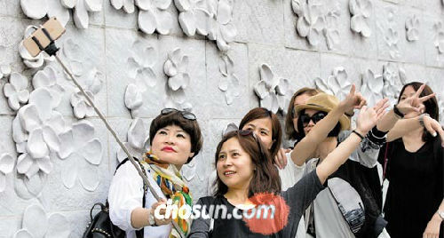 5月2日,在首尔梨花女大正门旁雕刻着梨花的墙壁前,中国游客们拿着自拍杆在拍照留念。