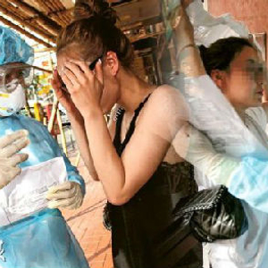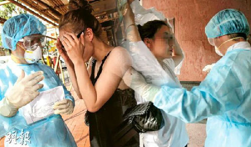 5月30日,香港卫生署人员在铜锣湾将两名曾拒绝隔离的韩籍女子带走(图片系合成)。(香港《明报》网站)
