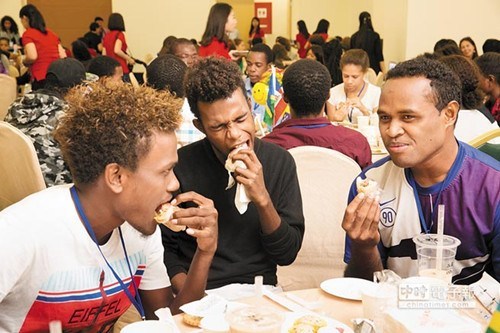 2014学年度台湾奖学金及华语文奖学金新生欢迎会,主办单位准备票选最受欢迎的台湾美食小笼包、牛肉面、葱油饼等,外籍新生享用后,脸上露出奇妙的表情。“中时电子报”图