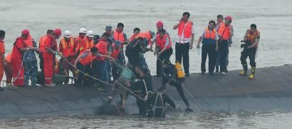“有人上来了。”2日15时08分,在露出水面的沉船底部平台,顺着一名工作人员手指的方向,一名穿着救生设备的年轻小伙子从水里露出。