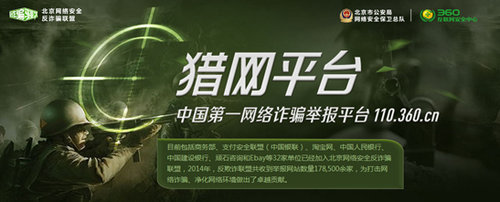 中新网5月12日电 “北京网络安全反诈骗联盟”今日在京发布了网络诈骗全民举报平台——猎网平台(110.360.cn),这是北京市公安局网络安全总队与360互联网安全中心共同发起“北京网络安全反诈骗联盟”一年后,针对网络诈骗的又一重要举措。
