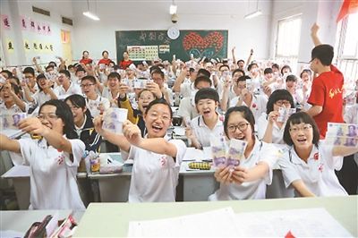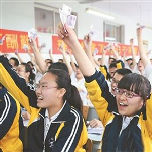 6月3日,河北衡水二中为每位备战高考的高三学生发放了两张5元崭新连号人民币留作纪念。十元钱代表“十全十美”,连号则代表“顺顺利利”,这是该校多年来考前减压活动之一,也是送给考生们的真诚祝愿。收到学校的“福利”和祝福,考生们开心不已。 (6月4日中国新闻网)