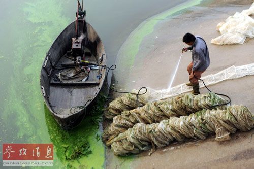 资料图片:2013年10月2日,在安徽合肥十五里河入巢湖口处,一名渔民在用高压水枪冲洗被蓝藻污染的渔网。新华社发(杨晓原 摄)