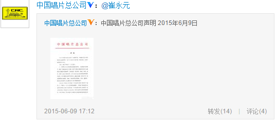 腾讯娱乐讯 主持人崔永元8日发微博质疑中国唱片总公司涉泄露国家机密,理由是对方讲我国珍贵文献母交给一家中日合资公司来完成数据化处理。9日下午,中国唱片总公司官方微博回应崔永元此前的质疑,并做出声明否认违法泄密。