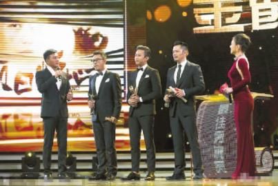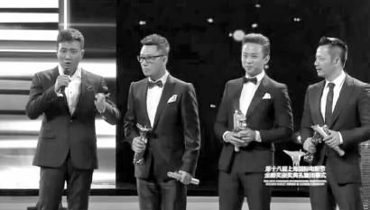 左起:主持人胡军和本届金爵奖影帝郭涛、邓超、段奕宏,他们都出自中戏表演系,分别为1987级、1988级、1998级、1994级
