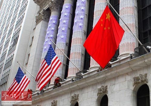 资料图片:中美两国在经济合作领域的基调正逐步接近。图为纽约证券交易所同时悬挂中美国旗。