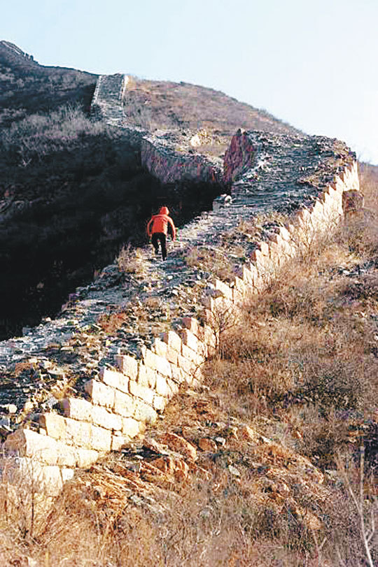 工作人员在花家窑残长城上巡查。(香港《东方日报》)