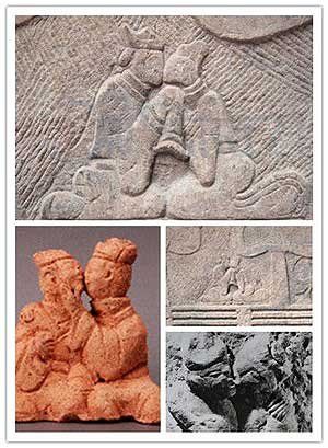 中国出土的汉画像石上的男女接吻图便是佐证。男女跪坐于地无论是搂抱接吻还是托领接吻,都证明了汉代房中术盛行的情况下,古人接吻礼俗早已有之。