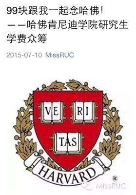 近日,人大学生欲众筹81万元赴哈佛留学的报道引发关注。报道称,毕业于中国人民大学商学院国际商务专业的吴俊东,今年3月获得了哈佛大学肯尼迪学院的硕士名额,但96万元人民币的学费令他苦恼。为此,他于7月10日发起了“99元和我一起上哈佛”的众筹项目。