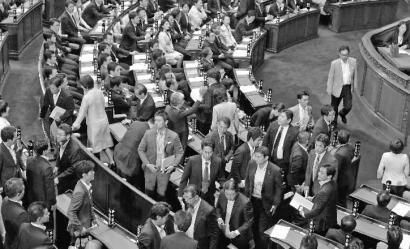 这一幕前一天便在国会议事堂上演。执政党控制的众议院和平安全法制特别委员会当天结束安保法案审议后,数十名在野党议员聚集在会场内,喊着“不,不,不”,手举“打倒安倍政治学”“反对强行表决”“自民党真差劲”等标语,围住委员会主席浜田靖一,试图阻止表决。只是,自民党和公明党议员还是凭借人数优势通过法案,提交众议院全体会议。