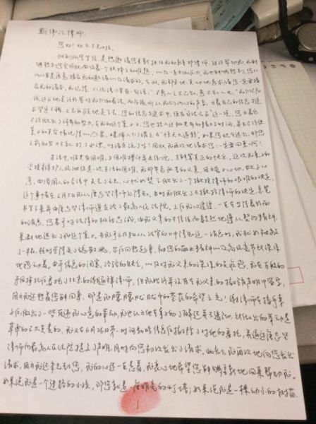 此刻向您写信,是想邀请您重新担任我的辩护律师,继续帮助我。我能够想到您会因此面临着一个抉择上的难题,以及一系列的压力,我也能够想到,您从内心是愿意接受我的邀请以及请求的。在此,我郑重地、真切地恳求,请您一定要接受我的请求。我记得,《论语》里有一句话:“不患人之不己知,患不知人也。”我们不应该过分地关注外界对我们的看法,而应该听从我们内心的声音,为着自己的信念与追求坚定不移、义无反顾地走下去。您的信念与追求中,便有“司法公正”这一项,您为着它已经做出了许多的努力。在我的这个案子上,您也投入过极其多的精力与时间,并且已经使案子的真实情况得以凸显,媒体人们谓之为“惊天大逆转”。如果您现在退出,那您之前的努力不就打了水漂,付诸东流了吗?因此,我再次地请求您:一定要回来啊!