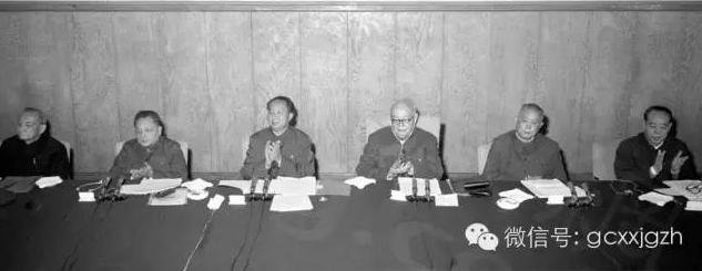 1978年12月18日至22日,中共十一届三中全会在北京召开。陈云、邓小平、华国锋、叶剑英、李先念、汪东兴(自左至右)在十一届三中全会上。