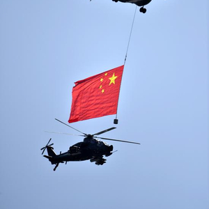 中国利用神舟飞船返回着陆的降落伞技术制造了巨幅国旗和军旗。 9月3日纪念抗战胜利70周年的大阅兵中,直升机悬挂着这两面旗帜,以每小时180公里的速度飞过天安门,接受党和国家领导人的检阅。