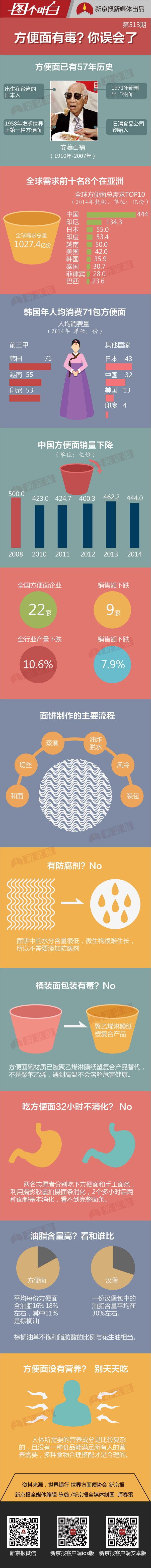 深夜,饥肠辘辘,这种时候想要“5元吃饱吃好”,方便面一定第一个进入脑海。从1958年被发明至今,方便面能称霸方便食品界,不是没有原因的。便宜、热乎、顶饱,绝对是深夜加餐、宿舍必备、旅行必带之佳品。但很多时候,伴随着浓重面味飘过的,还有深深的罪恶感——妈妈早就说过不要吃垃圾食品。2008年,中国方便面年销量曾达到500亿份,2014年减少到444亿。人口增长了,方便面却吃得少了。除了商业因素,健康饮食理念的深入也是原因之一。防腐剂、没营养、难消化、包装有毒……各种“骂名”一直让妈妈们对方便面怀着深深的怨念。