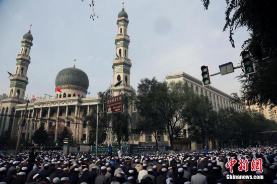 9月24日,青海省西宁市超过15万穆斯林民众齐聚到拥有900多年历史的西宁东关清真大寺会礼,喜迎古尔邦节。青海省穆斯林人口数约占该省总人口五分之一。古尔邦节是伊斯兰教两大节日之一,又称宰牲节,与开斋节并称为伊斯兰教的两大节日。图为在西宁东关清真大寺外参加会礼的穆斯林民众。中新社记者 罗云鹏 摄