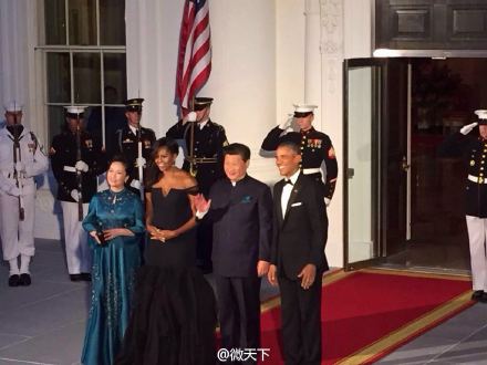 #习近平访华盛顿#【彭丽媛宝蓝礼服亮相】新浪国际在白宫报导,北京时间26日早晨7时,中美两国领导人抵达国宴,米歇尔穿着华裔设计师Vera Wang的黑色礼服,彭丽媛则换下上午的粉红套装,穿著宝蓝色长礼服,手拿深绿色晚宴包。习近平穿着黑色正装,左胸前的宝蓝领巾,搭配夫人的礼服颜色。(新浪)