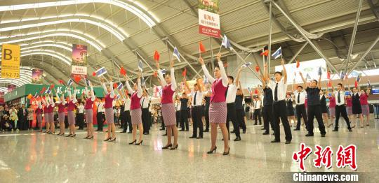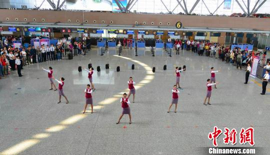 郑州机场空姐演绎国庆欢乐舞。 杨现利 摄