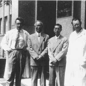 1960年,黄鸣龙(左二)与周维善(左三)在捷克科学院有机和生化研究所前合影(周维善供图)
