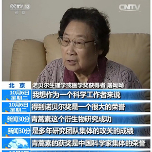 [屠呦呦:这是中国科学家集体的荣誉]屠呦呦通过央视正式发表获奖感言:获诺奖是一个很大的荣誉,青蒿素研究成功是多年研究集体攻关的成绩,青蒿素获奖是中国科学家集体的荣誉。这也标志着中医研究科学得到国际科学界的高度关注,是个入口。(央视记者史迎春)