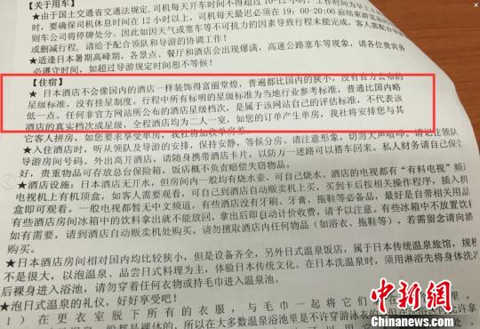 10月13日,记者见到了其中一位投诉游客李红(化名)女士。其称,7月初,花费了7268元在旅行社报名,带女儿参加日本本州亲子六日游。据其出示给记者看的宣传单照片显示,上面注明“全程入住四星级酒店”、“一晚入住露天温泉酒店”、“巡礼富士山风景区”等内容。