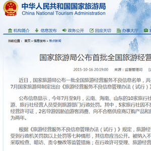 近日,国家旅游局公布一批全国旅游经营服务不良信息名单,共有17家企业和个人“榜上有名”。这是今年7月国家旅游局制定出台《旅游经营服务不良信息管理办法(试行)》以来公布的首批名单。