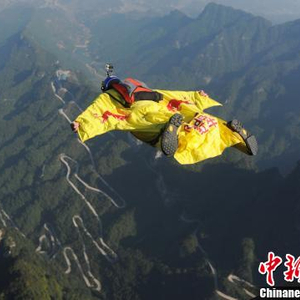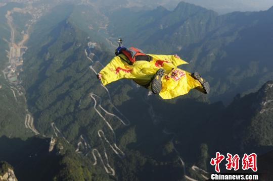 在湖南张家界天门山的上空,身着翼装飞行服的张树鹏煽动着“翅膀”,像只鸟儿一样在群峰耸立、地形复杂的天门山大峡谷中极速飞行。