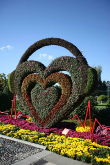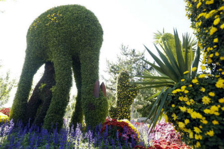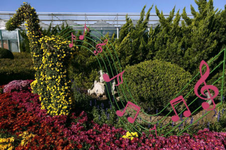 本次艺菊展共包含12组绿雕造型景观,景观由各种植物扦插而成,其中以各色小菊为主,配以红草、银叶菊、绿叶粉海棠、红叶红海棠、白色佛甲草、黄色 反曲景天和麦冬草等,合计扦插面积约500多平方米。与往年不同的是,每组景观均由多个绿雕造型构成,并加入了各种铁艺造型,使游客能够自然融入景观所营 造的氛围之中,体会和感受到不同绿雕景观背后所传递出的不同的寓意。12组景观都紧扣“音乐”这个主题,更加注重整体 气氛的营造。位于南门入口凡尔赛广场中轴路两侧的绿雕景观“悦动的音符”,用盛放的菊花载满了秋天的热情,通过列阵式的布置方式带给人以迎宾庆祝的欢乐节 日气氛,让悦动的音符拉开金秋赞歌的序幕。再如凡尔赛广场西侧绿地的“丰收赞歌——蛙鸣蒲叶下”:源于唐代诗人王建的诗《汴路水驿》之“蛙鸣蒲叶下,鱼入 稻花香”,渲染出了一个“青蛙在蒲叶鸣唱,鱼儿在香气迷人的稻田里翔游”的景象,奏响和谐悠扬的丰收赞歌。