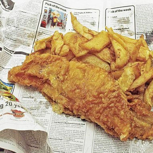 英国美食炸鱼薯条,过去常用报纸包装,可边吃炸鱼边看新闻。