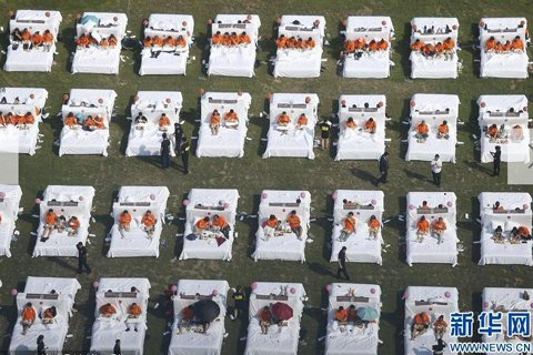“最多人在床上吃早餐”的吉尼斯世界纪录挑战现场。(图片来源:新华网)