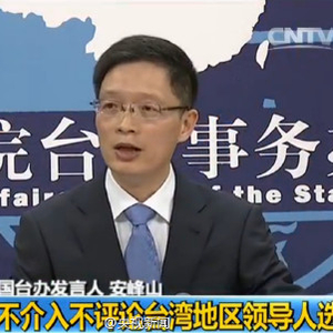 国台办发言人安峰山:我们不介入、不评论台湾的选举。就两岸关系而言,从2005年,特别是2008年以来,国共两党在坚持“九二共识”、反对“台独”的共同政治基础上,推动两党关系和两岸关系取得了重要积极的进展。当前两岸关系再次处于一个重要的时间节点,希望两党继续在这一共同的政治基础上,巩固和增进政治互信,坚持两岸关系和平发展的正确方向,为维护台海局势的和平稳定,造福两岸民众,来继续不懈努力。