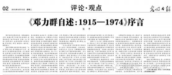今年9月15日,《光明日报》刊发宋平为《邓力群自述:1915—1974》一书所作的序言。