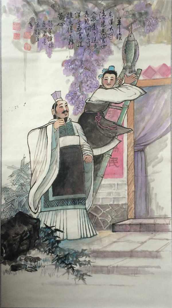 东汉名臣。在南阳郡任太守时,一位府丞见羊续生活清苦,特送来一串当地特产——白河鲤鱼。羊续很为难:收,有违为官之道;不收,有负下属盛情。于是,便将鲤鱼悬挂于庭檐下,久之便成鱼干了。之后,下属又送鱼来,羊续手指鱼干,轻轻摇头。下属为羊续的清廉自守和良苦用心所触动,含羞而去。