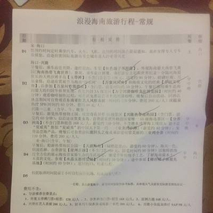 这份行程单并不是海南省规范的旅游合同书,纸上只标明了5天内的行程、需要自费的项目和价格,却没有旅行社名称、公章、签约人姓名、行程日期、违约责任等信息。