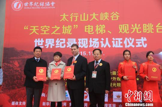 中新网太原11月17日电 (刘小红)位于山西省太行山大峡谷景区内的208米全露天悬崖观光电梯和被赋予“天空之城”之称的多层透明观光眺台,因其别出心裁的设计,自2015年10月对外开放以来就吸引了众多海内外游客。17日,这部电梯及观光眺台通过世界纪录协会现场认证。