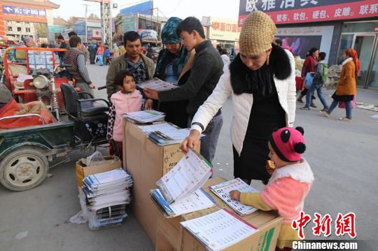 销售文化用品的摊位是孩子的最爱。莎车县第一小学一年级学生看到摆放着的汉语拼音就读了起来。她的母亲花10元买了一套汉语拼音字母表,“她读没问题,空闲时再练练书写”。老板阿比迪诺尔·依米提说“一天最少卖出50套维吾尔语字帖和汉语拼音”。